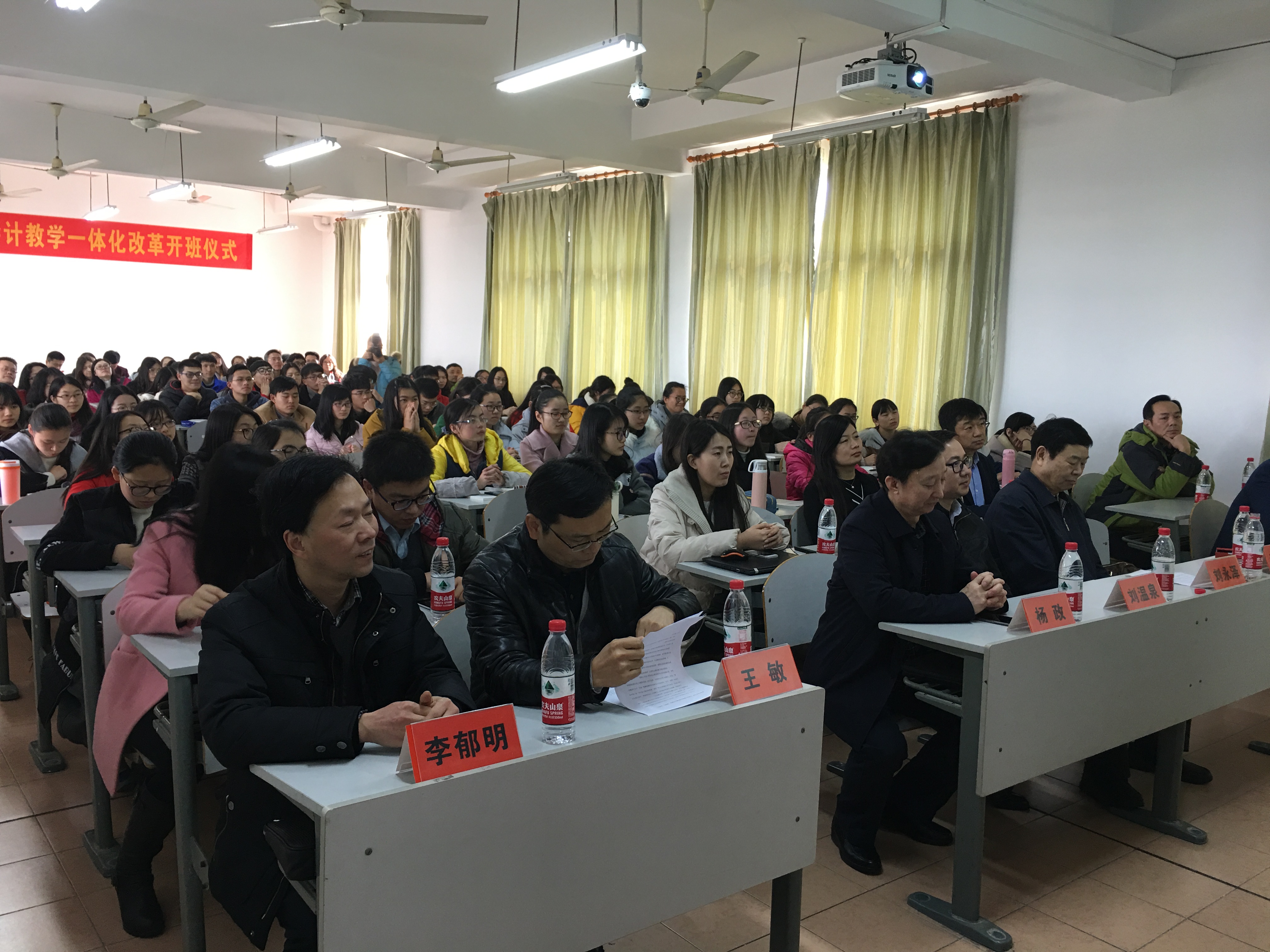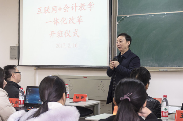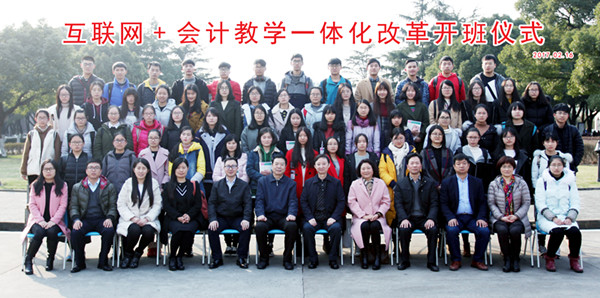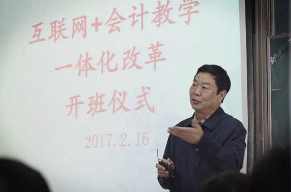 2017年2月16日下午,互联网+会计教学一体化改革开班仪式在第一教学楼503教室隆重举行。中国会计学会副会长、中国会计教育专家委员会主任委员刘永泽教授、中国会计教育专家委员会秘书长杨政教授、正保远程教育集团高级副总裁刘温泉先生、正保远程教育教学服务部副总裁徐建宁女士、我校社会合作处处长袁志明、教务处副处长王敏、袋鼠影视 院长潘煜双、党委书记邵燕、副院长李郁明、副书记陈云飞,各系主任和会计、财务专业教师以及会计162、163教改实验班全体学生参加了开班仪式。