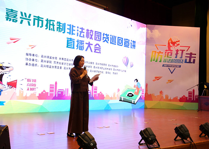 为了让更多的学生了解非法“校园贷”的危害,9月21日晚,嘉兴市抵制非法“校园贷”巡回宣讲嘉兴学院专场暨金融安全宣传月启动仪式在我校越秀校区教二报告厅举行。嘉兴市政府副秘书长、团市委副书记于会游,嘉兴银监分局副局长孙宏杰,嘉兴学院袋鼠影视 院长潘煜双,浙江省金融团工委、市公安局、市教育局、市金融办、嘉兴学院学生处、嘉兴职业技术学院学工部、同济大学浙江学院学生处、嘉兴南洋职业技术学校保卫处、嘉兴市各大银行相关负责人出席了活动。我校是本次宣讲活动的第一站,我校近600名学生参加了活动。