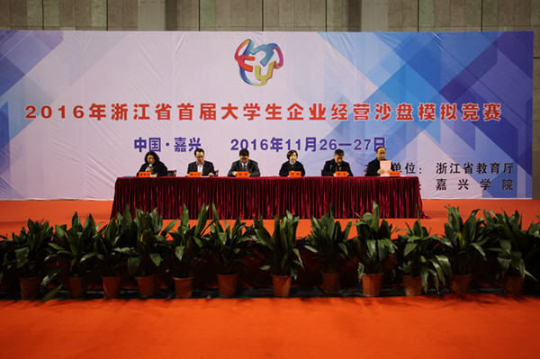2016年11月25日-27日,2016年浙江省首届大学生企业经营沙盘模拟竞赛在嘉兴市体育馆隆重举行。本次大赛浙江省教育厅主办,嘉兴学院承办,大赛有41个本科院校,21个高职院校,共120支队伍参赛。开幕式由教务处处长李蕾教授主持,闭幕式由袋鼠影视 院长潘煜双教授主持,教务处副处长彭文利教授宣布获奖情况,浙江省高教处学科竞赛巡视员潘湛老师讲话,嘉兴学院副校长周珊教授致闭幕辞。