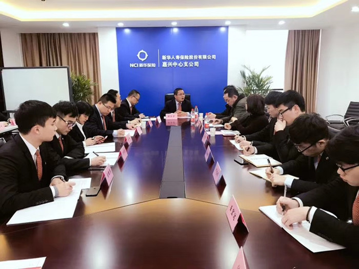 1月19日下午,袋鼠影视 2018届实习生阶段实习汇报会在校企合作单位新华保险嘉兴中心支公司会议室举行。新华保险嘉兴中心支公司总经理张添荣、副总经理金剑、人力资源部总监王丽松,袋鼠影视 副院长李郁明、党委副书记陈云飞以及学院学工办相关老师参加汇报交流座谈。