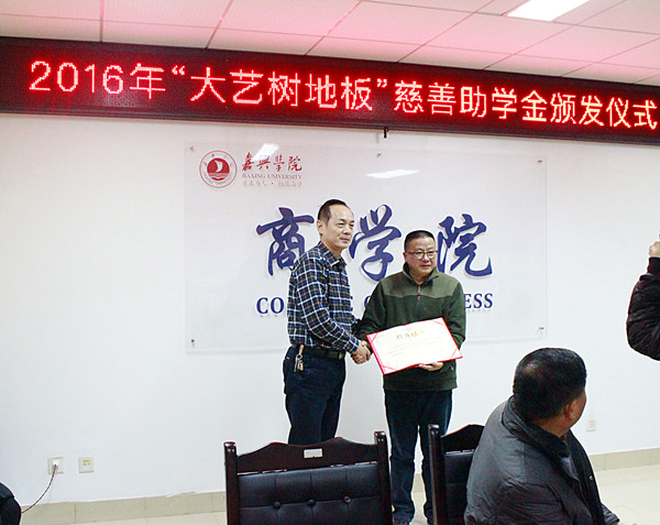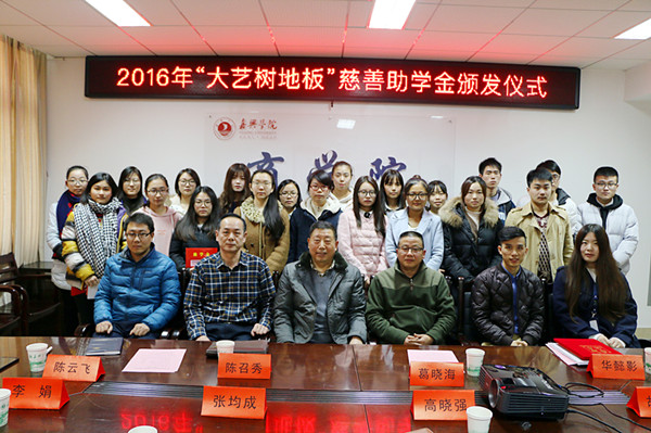 2016年12月22日下午,嘉兴学院袋鼠影视 2016年“大艺树地板”慈善助学金颁发仪式在教一604会议室举行。浙江良友木业有限公司副总经理葛晓海先生、良友木业人事部经理华懿影女士、良友木业有限公司副总经理助理张均成先生、良友木业办公室副主任高晓强先生、嘉兴市慈善总会会长陈召秀先生、李娟女士、袋鼠影视 党委副书记陈云飞老师,以及接受资助的20名学生参加仪式。袋鼠影视 辅导员胡笳丽老师主持助学金颁发仪式。