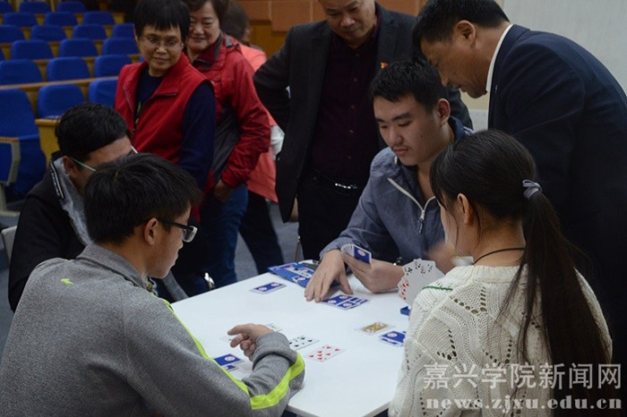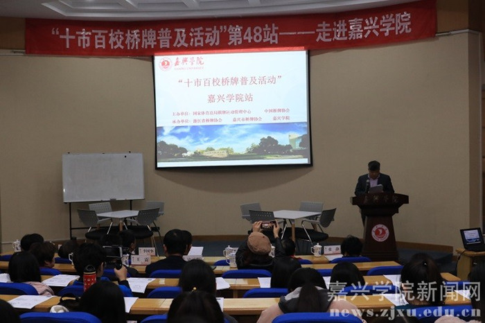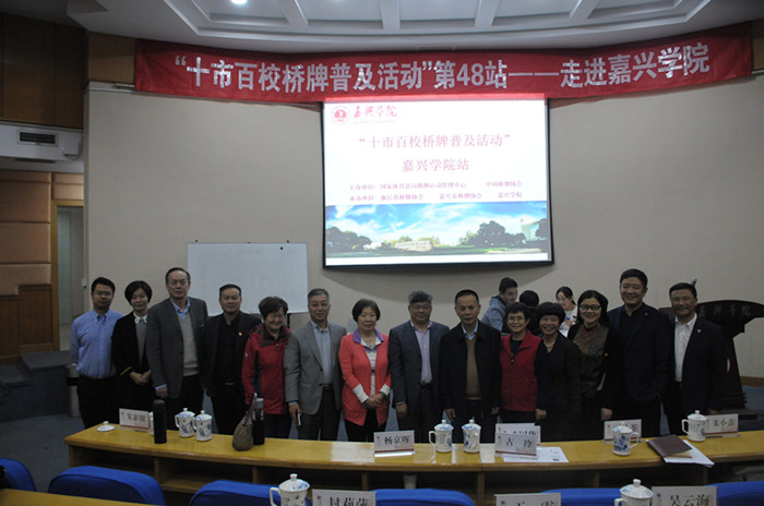 11月15日下午,由国家体育总局棋牌运动管理中心、中国桥牌协会主办的“十市百校校园桥牌普及活动”第48站在嘉兴学院顺利举行。浙江省桥牌协会主席寿剑刚、中国桥牌协会副秘书长李国华、学校党委副书记严从荃出席活动。桥牌世界冠军、世界特级大师古玲,世界大师朱小音,亚运会桥牌冠军、我校90届毕业生杨京晖等嘉宾作为桥牌普及推广大使参加活动。