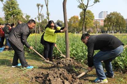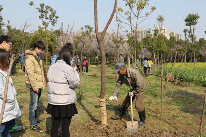 早上八点半,报名参加活动的同学陆续来到指定地点集合,然后步行前往梁林校区。虽然严冬的北风还未偃旗息鼓,初春的阳光显得姗姗来迟,但这些都未影响同学们的情绪,大家一路欢笑地来到了植树地点——校友林。现场分配好任务后,大家干劲十足,老师和同学一起拿起铁锹,相互协作,种下七棵香樟树。在植树过程中,来自后勤公司的师傅给大家做了技术指导,让同学们学习到植树的基本程序和关键细节。