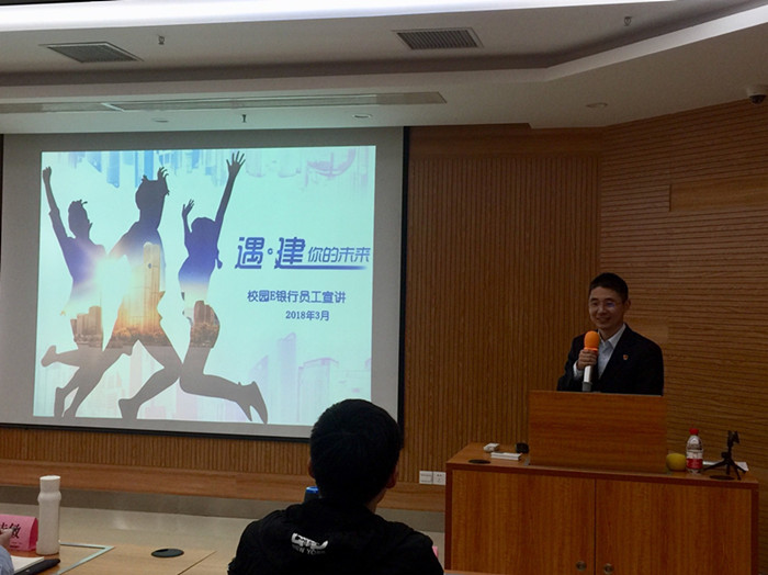 最后,大学生行员们还聆听了分行人力资源部王任刚见习副经理为“校园e银行”做的“遇建你的未来”主题讲座。王经理通过对建行嘉兴分行的袋鼠影视、发展历程的介绍,结合多年的人力资源经验给大学生行员们分享了职业生涯规划、招聘就业等内容。讲座结束,大学生行员们参观了行史陈列室、职工之家,近距离地感受到了建行“快乐工作健康生活”的浓浓氛围。