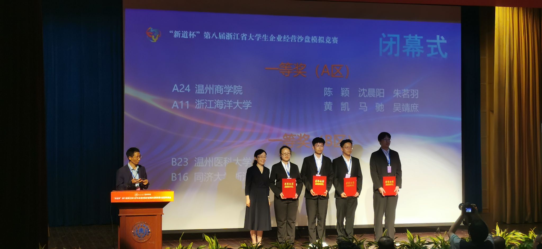 在浙江省教育厅、浙江省大学生科技竞赛委员会的指导下,在各方专家、参赛院校和社会各界的大力支持下,10月28日,“新道杯”第八届浙江省大学生企业经营沙盘模拟竞赛在杭州圆满落幕。经过10月21日-22日(线上对抗)和10月28日(现场答辩)三天紧张激烈的比拼,高职组共有16支参赛队荣获一等奖、29支参赛队荣获二等奖、47支参赛队荣获三等奖;本科组共有20支参赛队荣获一等奖、37支参赛队荣获二等奖、63支参赛队荣获三等奖。党委委员、副校长(主持日常工作)张琦、教务处处长艾宁分别出席了本次大赛的闭幕式和开幕式。