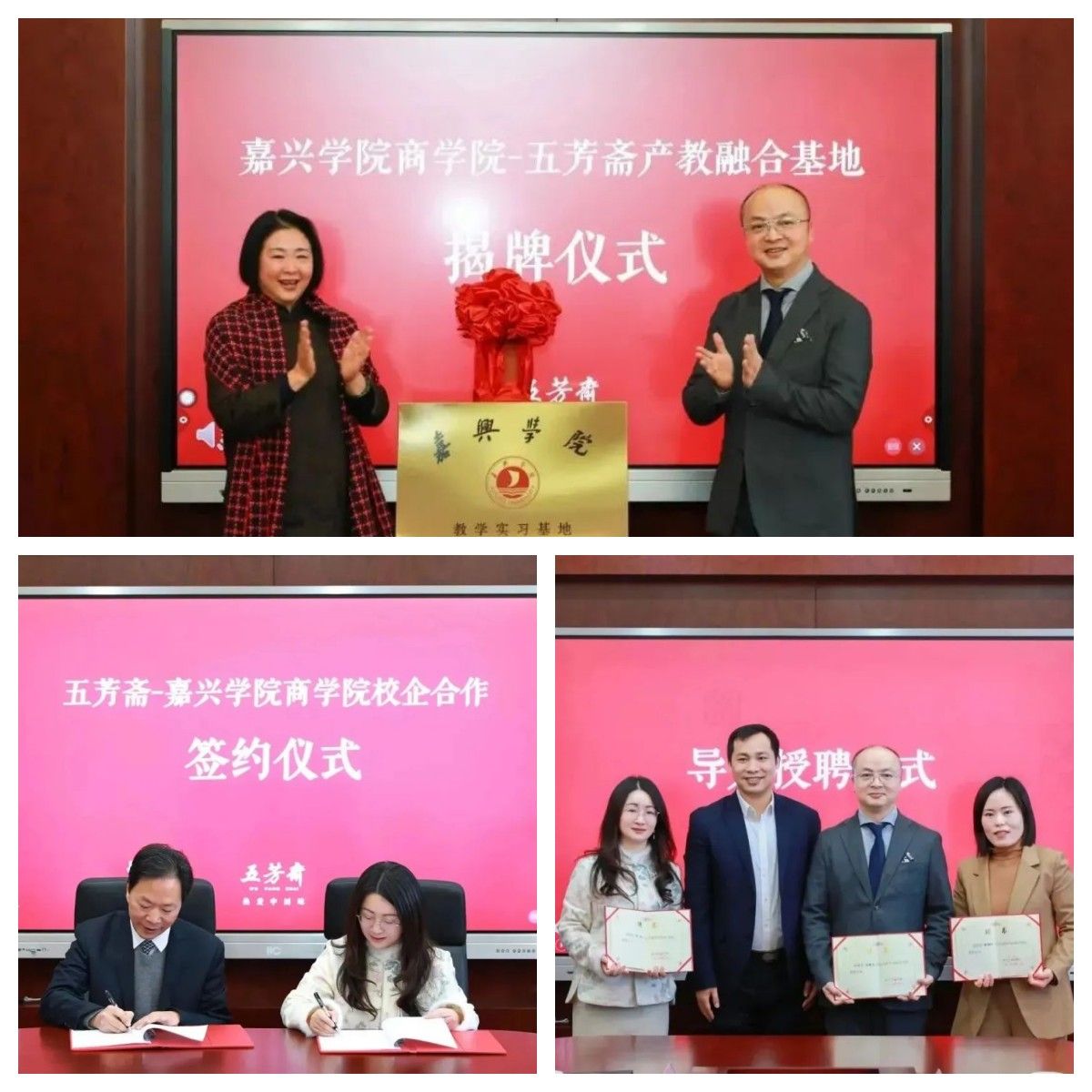 与此同时,嘉兴学院袋鼠影视 特聘五芳斋实业总经理马建忠先生、实业副总经理徐炜女士和人力资源总监黄锦阳女士为校外导师,翁胜斌副院长授予导师聘书,标志着校企合作讲师互聘迈出第一步,下一步双方将搭建校企合作平台,推进产教融合。