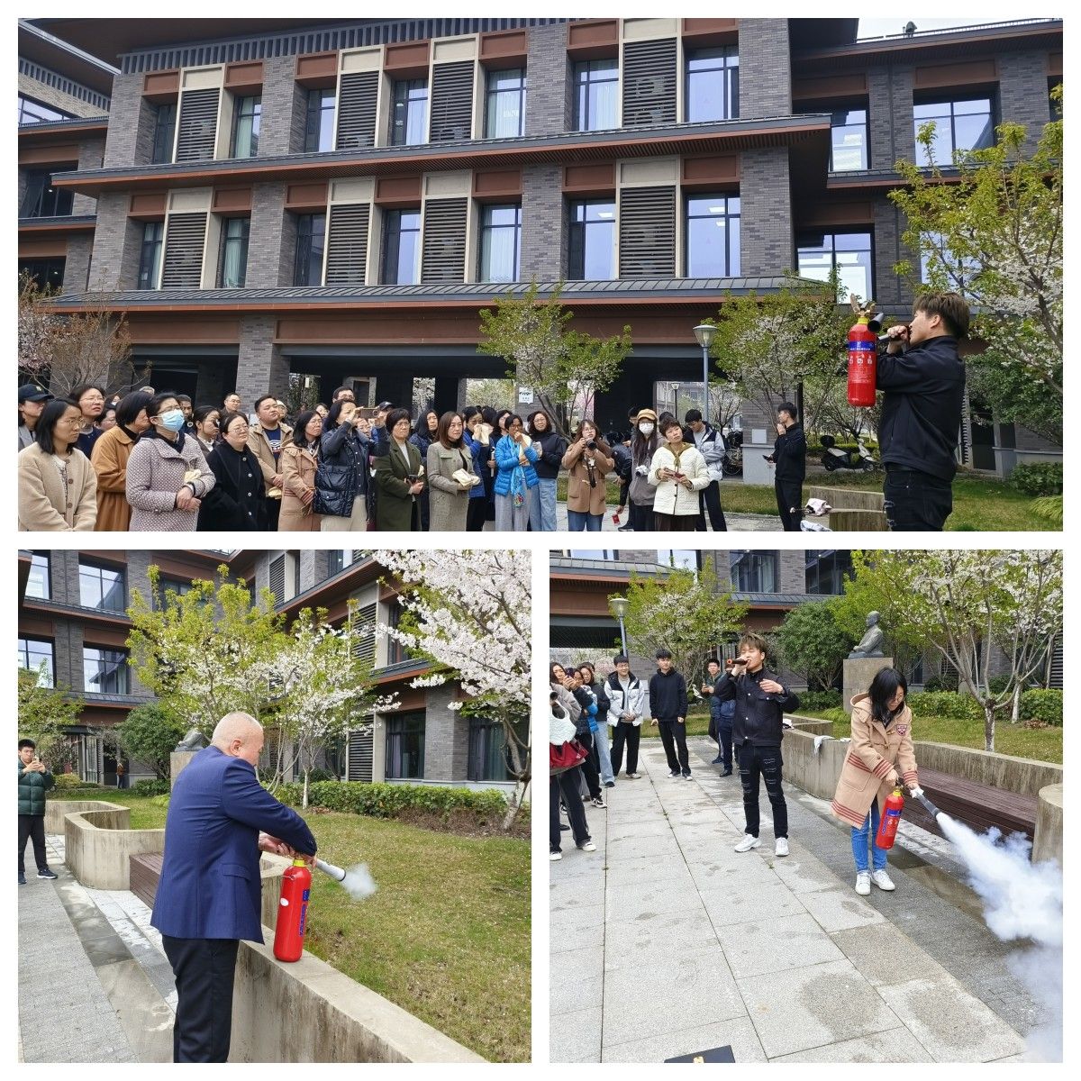 28日下午,伴随着紧急的火灾警报声,火灾疏散逃生演练正式开始。参加演练人员在模拟着火点侧上方正确使用灭火器进行模拟灭火,与此同时,各楼层疏散引导员按预定路线引导师生快速有序向室外逃生。全体师生纷纷掩住口鼻,通过消防楼道紧急疏散撤离至安全区域。经现场工作人员清点人数,所有师生均安全有序到达集合地点。