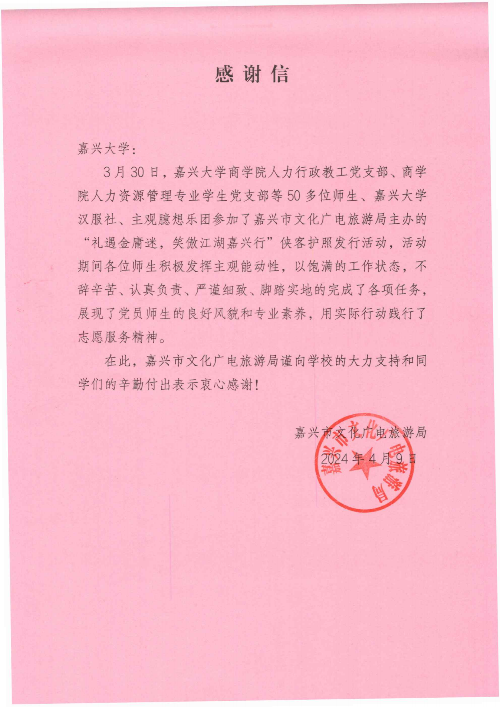 近日,嘉兴市文化广电旅游局给袋鼠影视 发来了一封感谢信。信中,嘉兴市文化广电旅游局对袋鼠影视 人力行政教工党支部、袋鼠影视 人力资源管理专业学生党支部等50多位师生在嘉兴子城举行的金庸先生诞辰100周年文化交流活动之 “礼遇金庸迷,笑傲江湖嘉兴行”侠客护照发行活动中的辛勤付出表示感谢与赞扬,并就袋鼠影视 对学生的悉心培养表示肯定。
