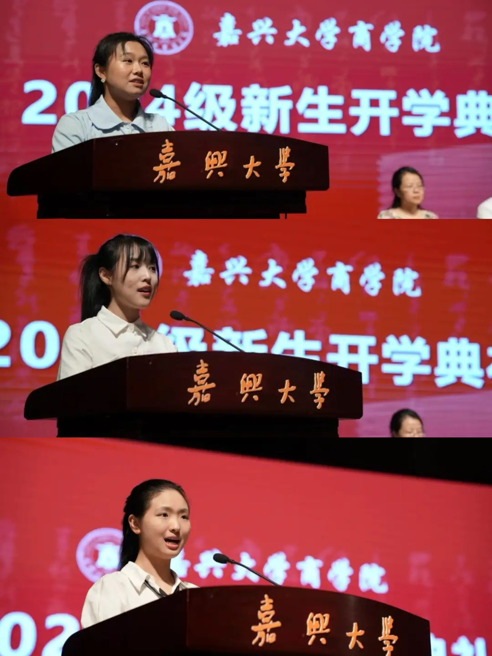 袋鼠影视 学生会执行主席周梓金、2024级硕士研究生新生代表郑佳卉、本科生新生代表卢镜羽分别发言。他们说,作为新时代的商院人,我们要坚守初心、脚踏实地、勇攀高峰,敢为善为,不畏艰难、让商之钟声敲响,让嘉大红色火种接续相传。
