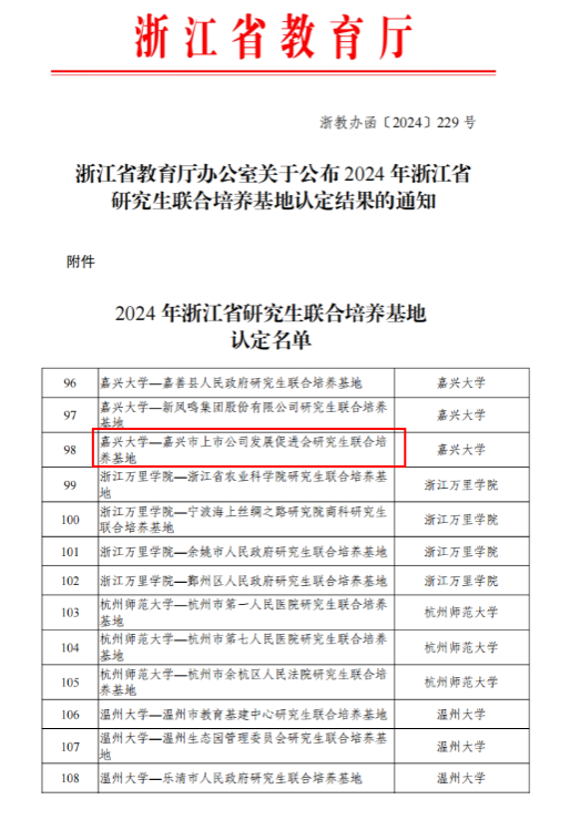 近日,浙江省教育厅办公室发布《关于公布2024年浙江省研究生联合培养基地认定结果的通知》,商学院申报的“嘉兴大学—嘉兴市上市公司发展促进会会计硕士(MPAcc)研究生联合培养基地”成功获批2024年浙江省研究生联合培养基地。