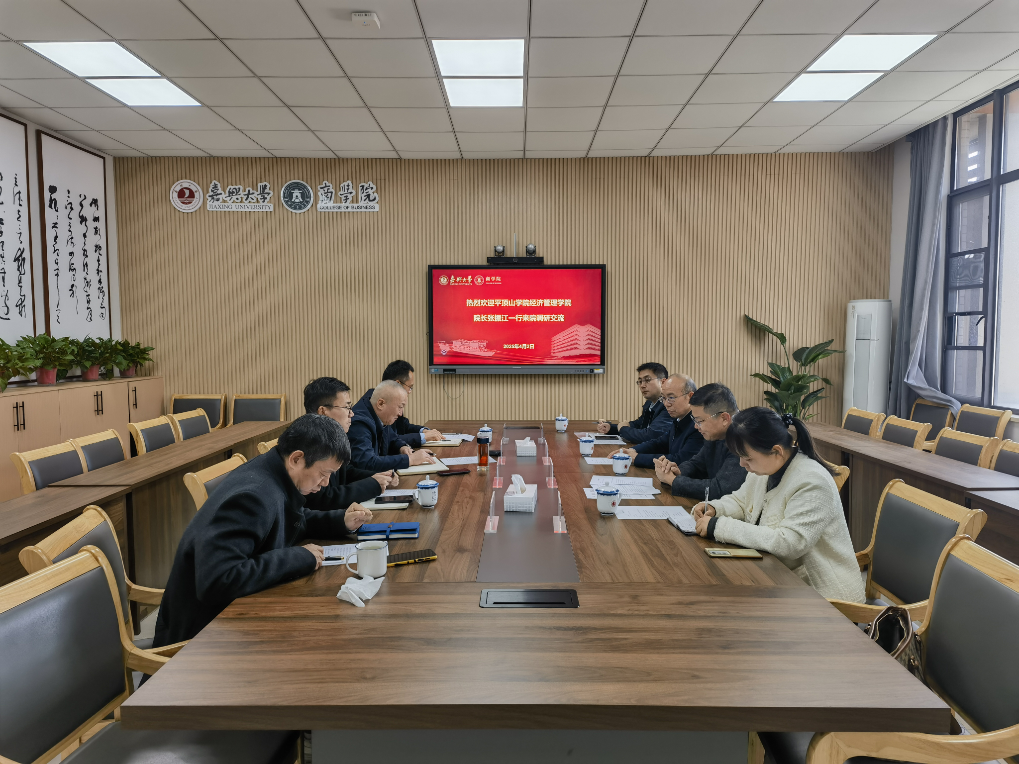 张振江对学院的热情接待表示了衷心的感谢,他简要介绍了平顶山学院经济管理学院的基本情况和近年的发展情况。李勇对张振江一行来院调研交流表示欢迎,并从历史沿革、组织架构、专业设置等方面对学院情况进行了介绍。胡进介绍了经济学院的基本情况。随后,参会人员就专业建设、人才培养等方面进行了深入交流,表示今后将进一步加强交流合作,促进共同发展。