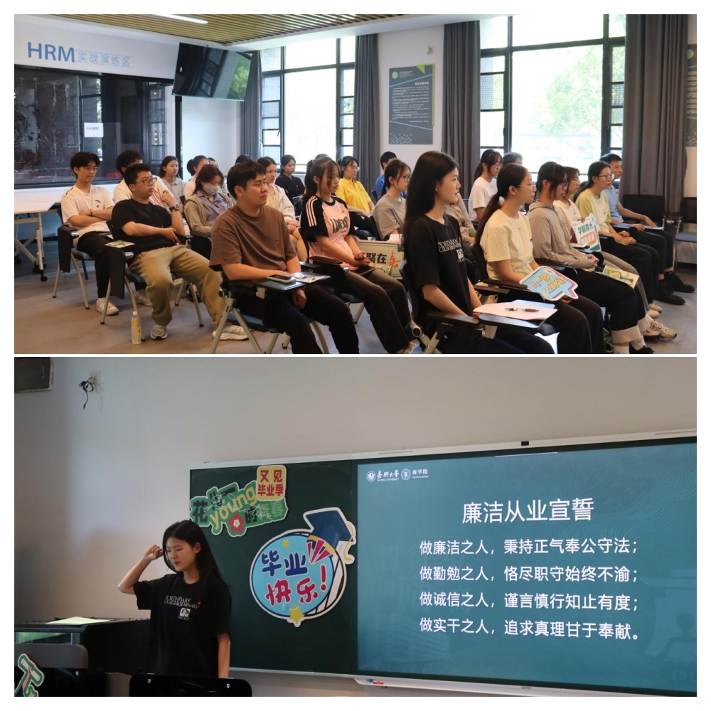 课堂最后,毕业生代表进行“廉洁从业宣誓”,通过学纪、知纪、明纪、守纪的实际行动,系好职业生涯的“第一粒扣子”,迈稳廉洁从业第一步。