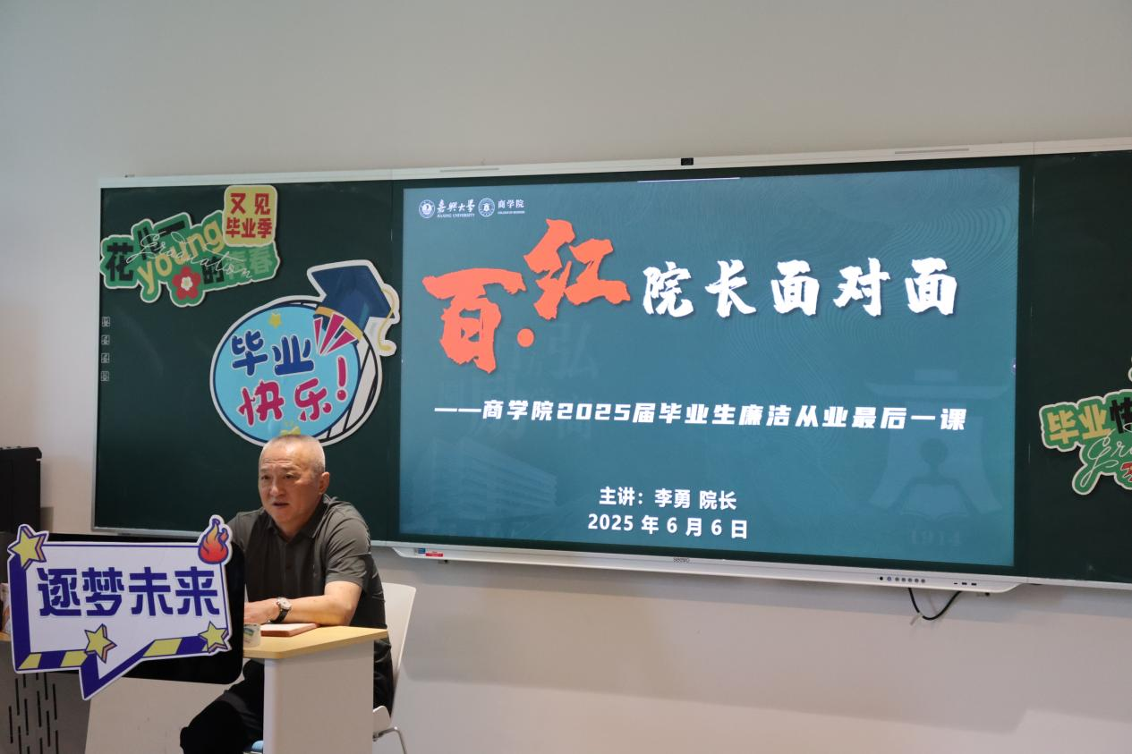 在毕业季的特别课堂上,李勇院长以自身求学、职场经历为引,向毕业生们深情寄语。他结合自身从求学到执教的成长经历,为即将踏上社会的学子们送上三点嘱托:一是要胸怀"国之大者",把个人理想追求融入党和国家事业之中;二是要永葆学习热情,在攻坚克难中锤炼过硬本领;三是要坚守廉洁底线,做明辨是非、知恩感恩的新时代青年。他深情寄语毕业生,希望广大商院学子能够传承商院精神,积极投身祖国建设,在民族复兴的伟大征程中书写属于自己的精彩篇章。