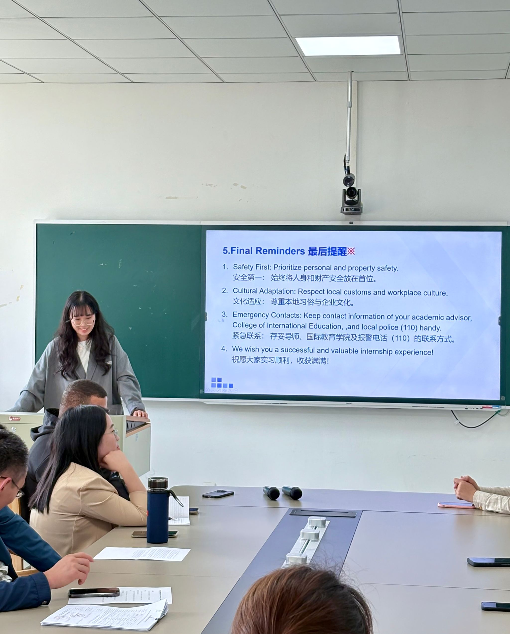 会议伊始,冯磊东代表学院对国际生企业实习与毕业论文工作提出几点要求与希望。他强调国际生在实习过程中要严格遵守中国法律法规,确保合法合规;保持安全意识,防范交通意外、电信诈骗及其他社会风险;毕业论文务必做到学术诚信、按计划有序推进。随后,国际教育学院王雨露老师就国际生企业实习的管理规范、安全须知及实习签注要求等进行了详细说明。她重点提醒学生:实习前必须办理实习签注,未经允许不得随意变更实习单位;实习地点较远需校外住宿,必须提前申请批准;实习期间要签订正式合同,明确工作内容与保险保障,确保合法权益。遵循安全第一、文化适应与紧急联络三项原则,保持好和辅导员与导师的密切联系,遇到突发情况及时求助。