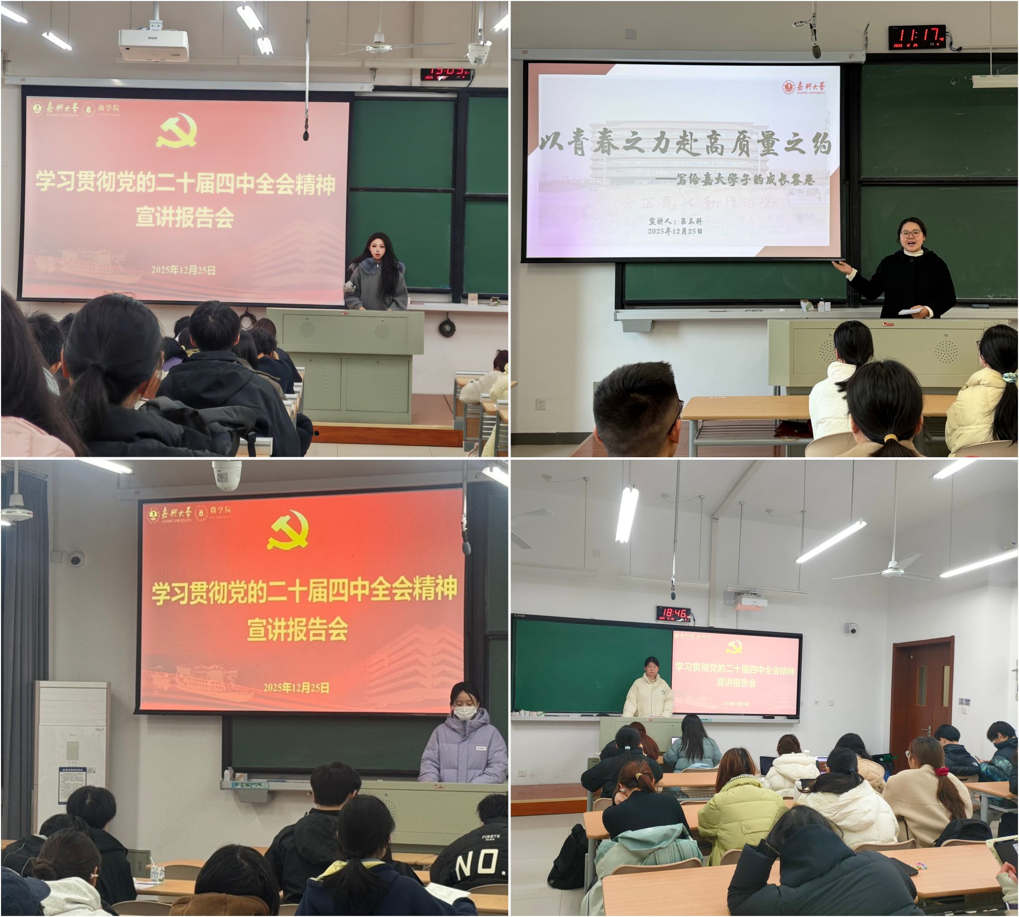 此外,学校青年宣讲团成员也面向学院学生进行了宣讲。吕玉科老师以《以青春之力,赴高质量之约》为题,结合袋鼠影视 实践,讲述学子应在学科建设、科研创新和精神传承中贡献青春力量;鲍箫仪同学以《新时代新青年的“十五五”已然扬帆起航》为题,将青年“小目标”融入国家“十五五”蓝图,描绘经济、交通、科技等美好愿景,强调青年是国家的建设者和接班人;陈怡菲同学以《让“高质量发展”在账本里落地生根》为题,从专业角度阐释如何通过精准数字和专业能力践行高质量发展理念;童瑶同学以《拾级而上,以“人民至上”绘就青春繁花》为题,借90后胡雷事迹和自身志愿服务经历,展现青年对“人民至上”理念的践行与担当。