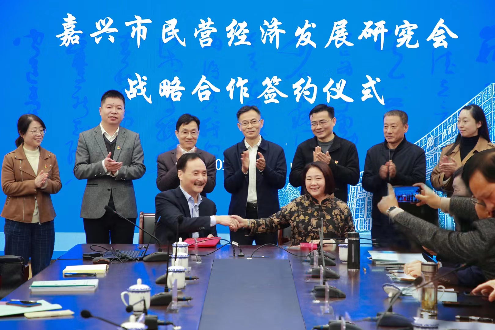 潘煜双与金惠明代表双方签署了战略合作协议。根据协议,双方将发挥各自优势,共同推进嘉兴民营经济研究,重点在民营经济发展模式研究、禾商经营管理案例的挖掘、提炼等方面进行合作,为推动嘉兴民营经济高质量发展贡献力量。