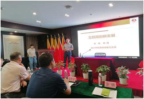 活动现场全体党员重温了入党誓词。应嘉兴市温州商会党委的邀请,营销信管教师党支部金镇教授以“互联网创新发展”为主题为商会所属党支部的企业党员们开展业务知识讲座。嘉兴市温州商会党委书记朱克友结合对企业竞争市场环境的关切,围绕中美关系与中国伟大复兴主题为在场党员们讲授一堂生动的主题党课。