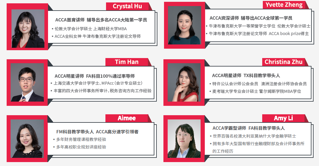 业界知名ACCA讲师团,资深大师级讲师,平均10年+授课经验,潜心研究教学内容,匠心研发独家中 文教材。多位讲师曾就职于全国500强、四大、国内上市公司等顶级企业,擅长采用理论与实践相结合的授课方式,辅导出多名ACCA大陆第一及全球第一学员,助力学员学业及职业的全面发展。