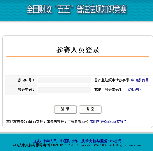 1、开机后,打开网页,再网址上输入网址“10.100.1.251“,以自己一卡通用户名和密码登陆外网,先点击上述网站中“财政法规知识竞赛”,进入“参赛人员登陆”界面,如下图所示,