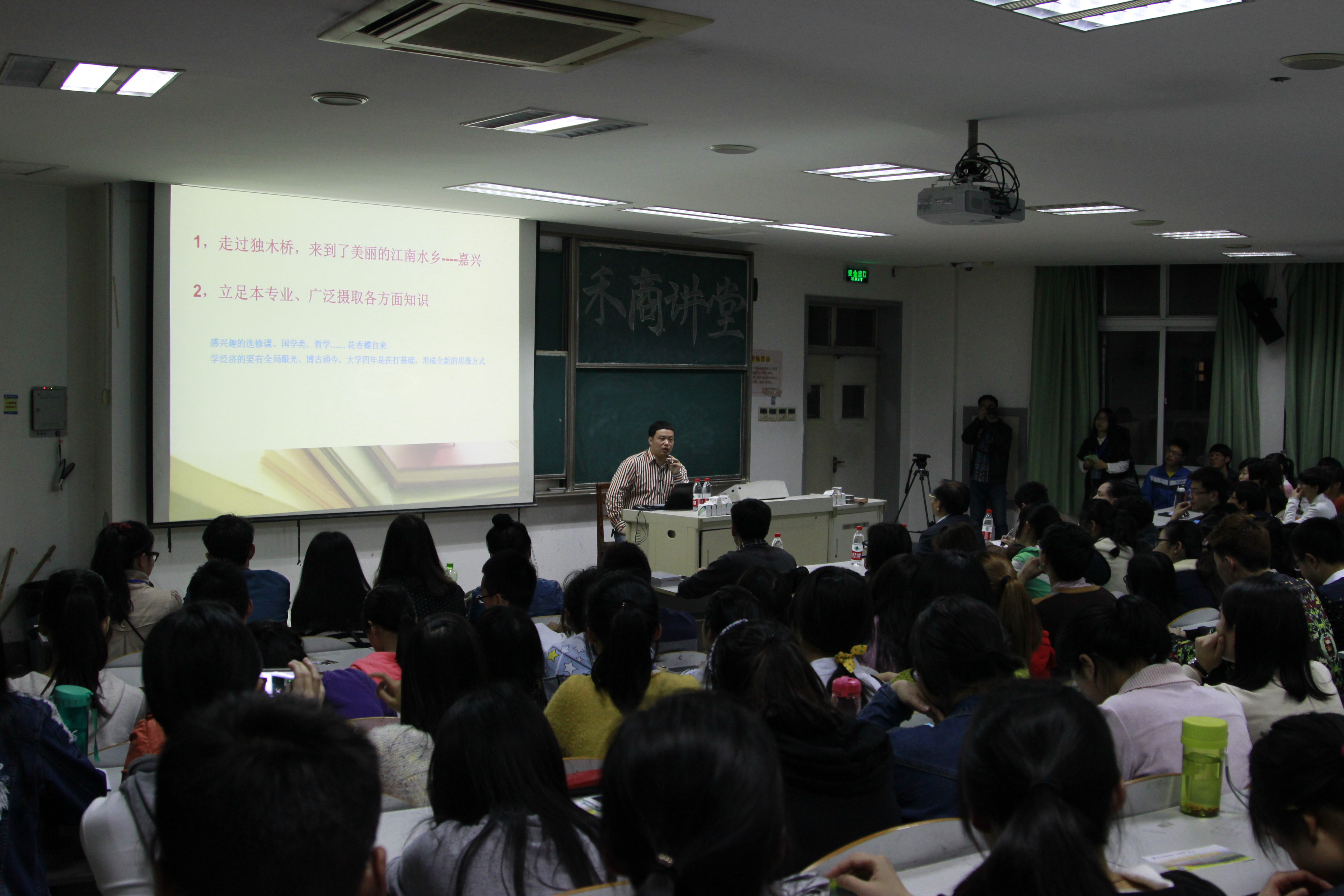2014年4月11日晚上,袋鼠影视 “禾商讲堂”第一讲在教一259阶梯教室开讲。钱方明院长担任首讲主持,袋鼠影视 91届物资经济专业校友,杭州朔阳投资管理有限公司董事长,业内人称“小李飞刀”的李永强先生应邀担任主讲。教室座无虚席,200张门票限额外的过道加座也在开讲前10分钟一抢而空,共有近300名师生参加了此次讲座。