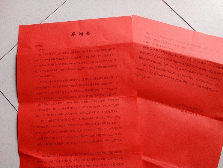 近日,嘉兴市第一医院、中医院先后送来感谢信、锦旗,对袋鼠影视 阳光义工中心志愿者的导医导诊志愿服务表示感谢,并对袋鼠影视 志愿者的综合素养给予了高度赞赏。自2011年起,阳光义工中心每周定期组织5-7名志愿者,分别前往两家医院为病人提供预约诊治、陪同取药、文明乘梯、搀扶病人以及陪老人挂点滴、聊天等志愿服务。每年平均志愿服务达30余次,600余小时。
