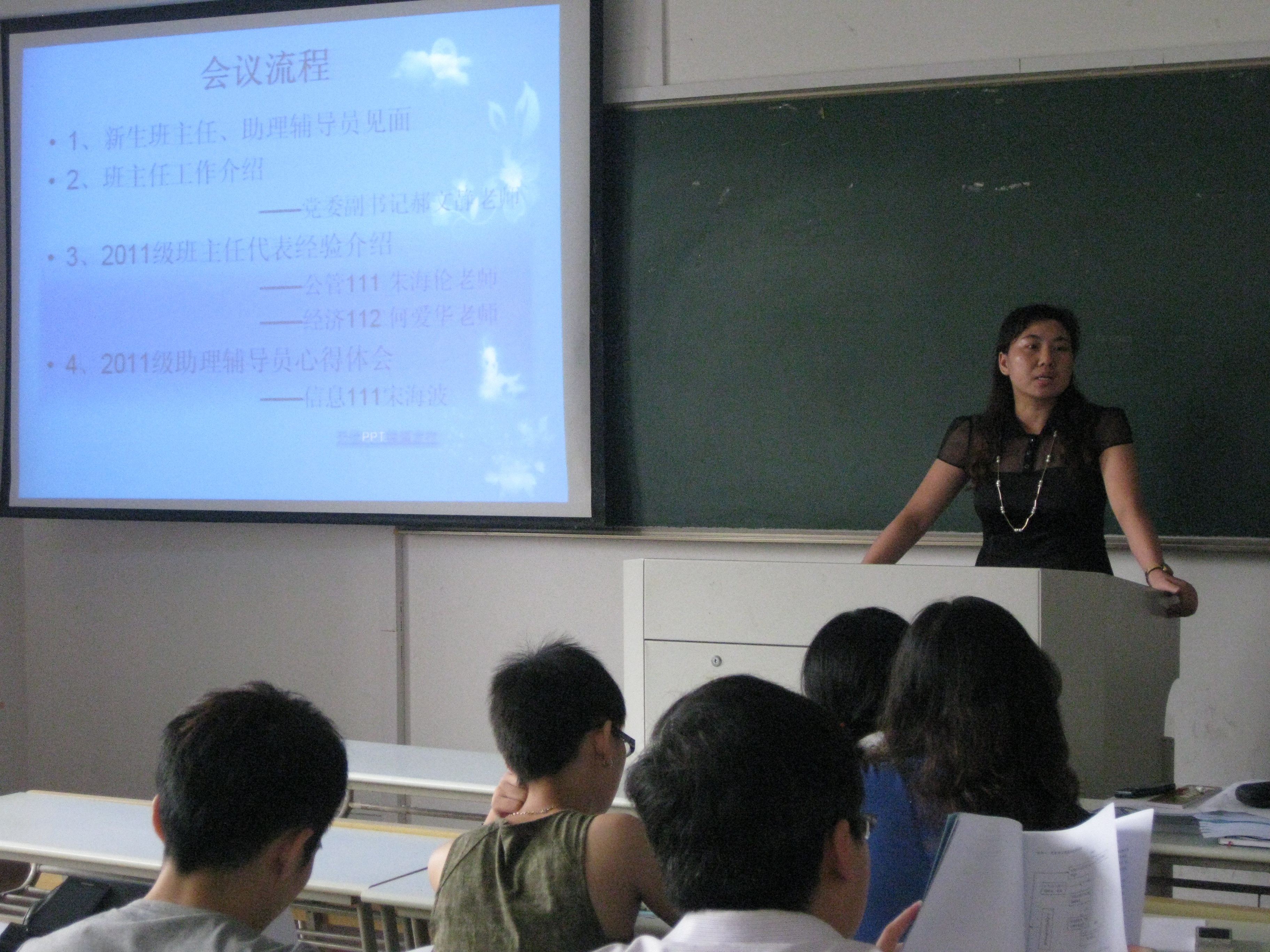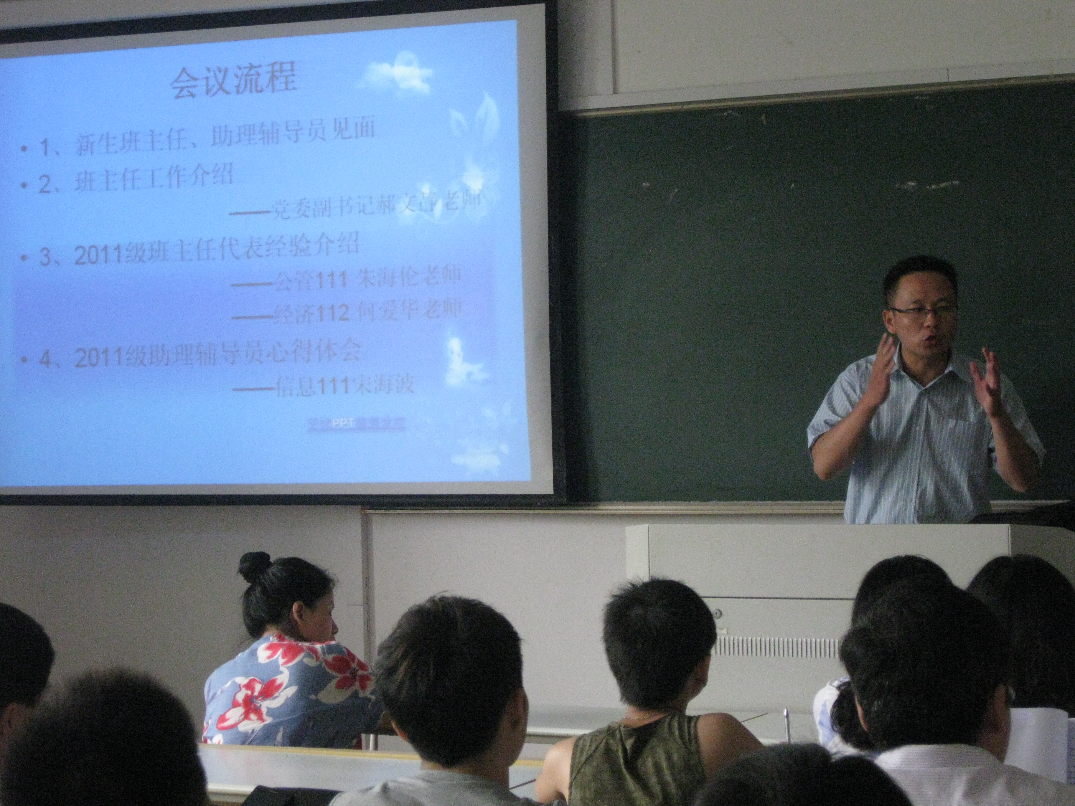 见面会上,新生班主任和助理辅导员结对而坐。2011级班主任代表朱海伦老师、何爱华老师,2011级助理辅导员宋海波同学应邀做了细致的经验交流。本次见面会使新生班主任、学生助理辅导员明确了自身的角色定位、工作要求和工作职责,为切实加强班主任、助理辅导员队伍建设,规范学生管理,提高业务水平,实现学生思想政治工作人员培训上岗、持证上岗搭建了有效的平台。