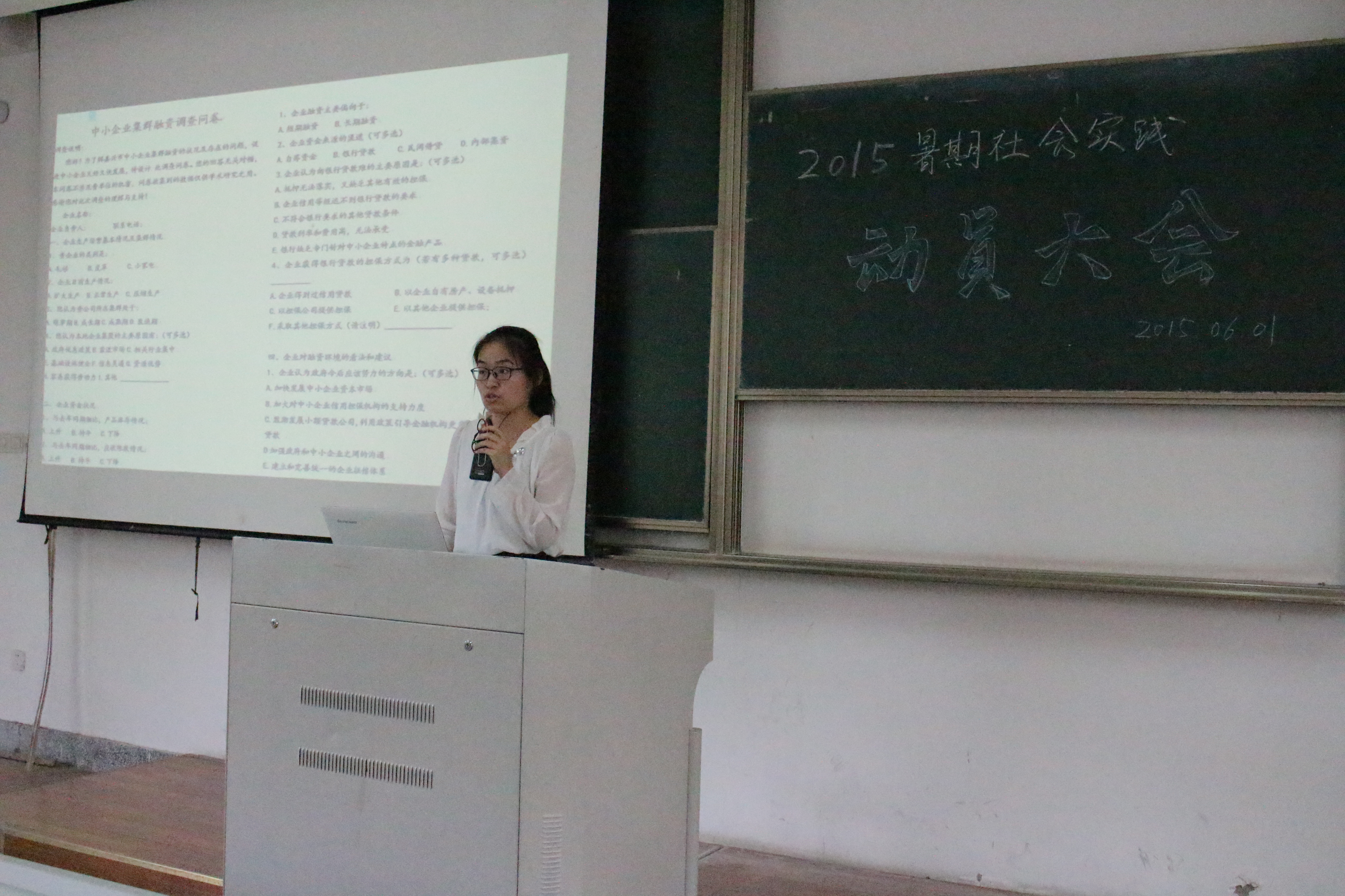 动员会围绕大学生专业调研与实践、 美丽浙江实践、 大学生党和国家政策宣讲、 大学生公益实践、 大学生创业创新实践五个实践主题展开。主讲人徐彩霞还对立项及评比的奖励、申报要求以及成果展示等多角度多方位进行全面具体的讲述。2014年暑期社会实践的优秀团队代表也从实际出发,讲述实践过程的同时也分享了他们的切身感受。最后,由团委副书记阮鋆燕为大家进行了最终的动员和鼓励。