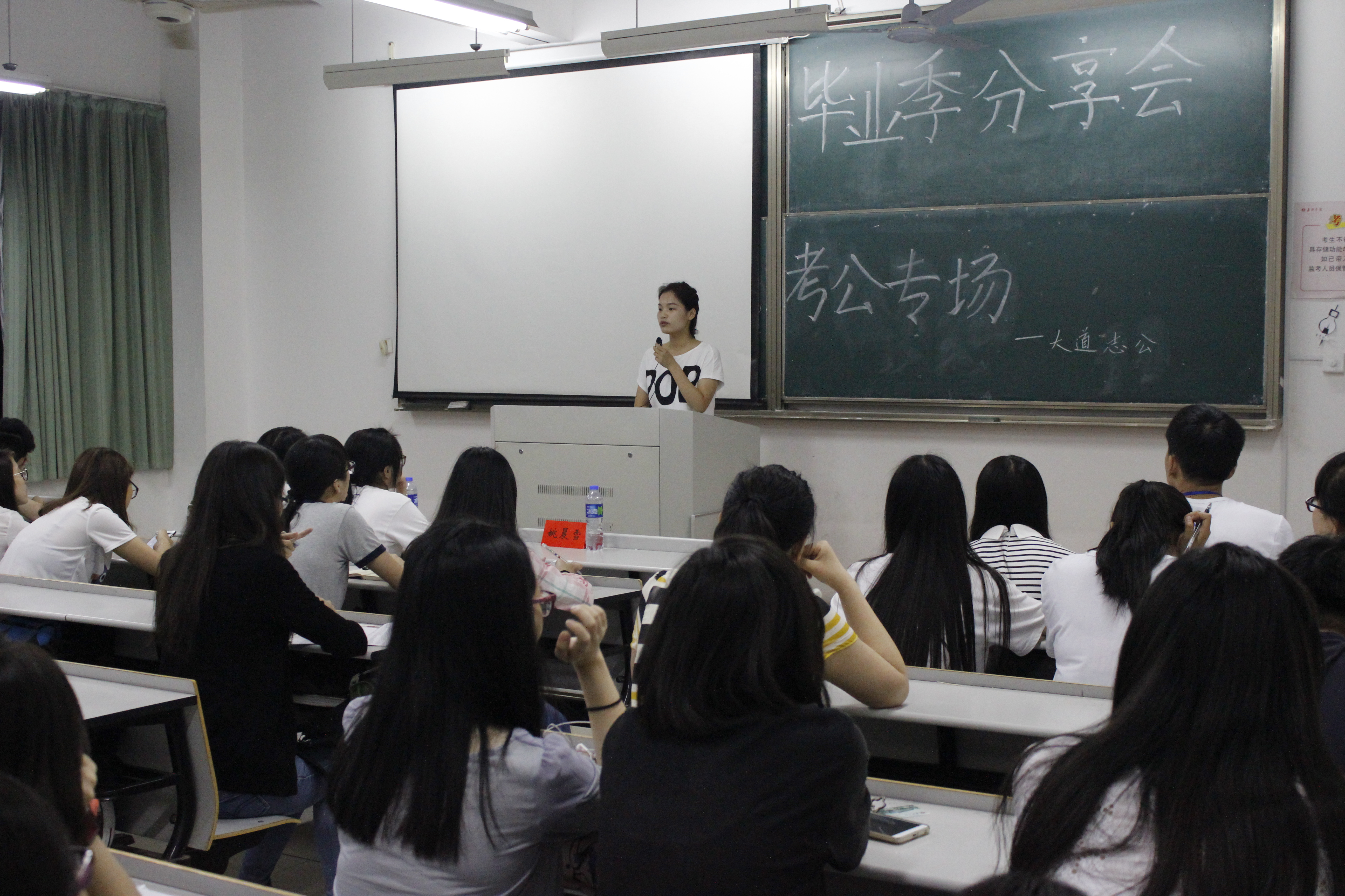 陈弯弯同学从自身经历出发,为在场各位同学提出了各个阶段应该做的事以及该准备的各类题型的方向。提醒大家一些考前该注意的细节,比如带好准考证,提前选好住宿地点等,并为大家分析了面试着装,谈吐举止等面试技巧。最后互动环节,现场情绪高涨,十分踊跃,同学们纷纷提出困惑并分享了自己的感受。陈弯弯同学还结合自己的经历,鼓励在场的同学要相信自己,选择自己喜欢的岗位并为之努力,不要半途而废。