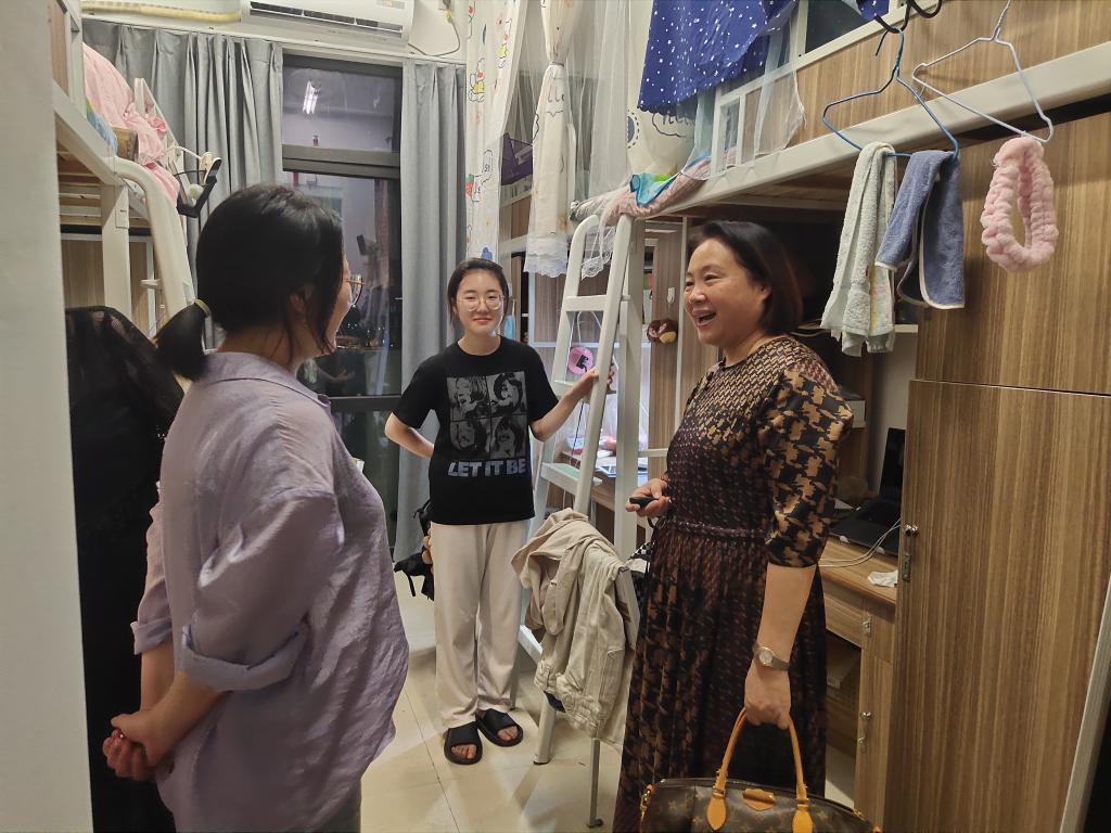 走访过程中,老师们查看新寝室房间布局、洗漱条件等,询问了解同学们对新校区新寝室生活住宿相关意见建议,对同学们的生活及学习情况进行了详细的询问和答疑。潘煜双对同学们顺利安全地返校给予了关心,在与准毕业生们亲切交谈,询问同学们考研准备与就业打算,一方面鼓励与期许他们能上更高的平台,另一方面也十分欢迎学生选择报考母校的会计专业硕士(MPAcc)。邵燕耐心倾听了同学们对今后的目标和规划,对大家选择并确立的考研目标表示了充分肯定并提出建议,鼓励大家既要扎实专业学习,阅读经典书籍,拓展知识面,更要学会张弛有度的学习,要勤于锻炼,规律作息。学院领导和老师们还特别叮嘱同学们要继续做好疫情期间的个人防护,严防各类诈骗,注重寝室卫生、寝室安全,建好寝室文化,鼓励同学们积极参与创新创业活动并树立积极、正确的就业意识,以健康的体魄、饱满的精神状态来完成新学期的各项学业及工作任务。