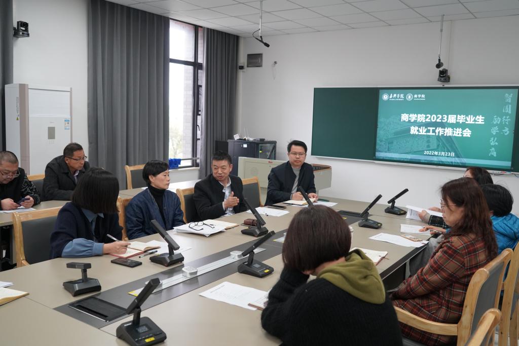 在尚德楼311召开2023届毕业生就业推进会。学院党委书记邵燕、党委副书记潘欣,以及全体系主任、辅导员和2023届毕业生班主任出席会议。会议由潘欣主持。