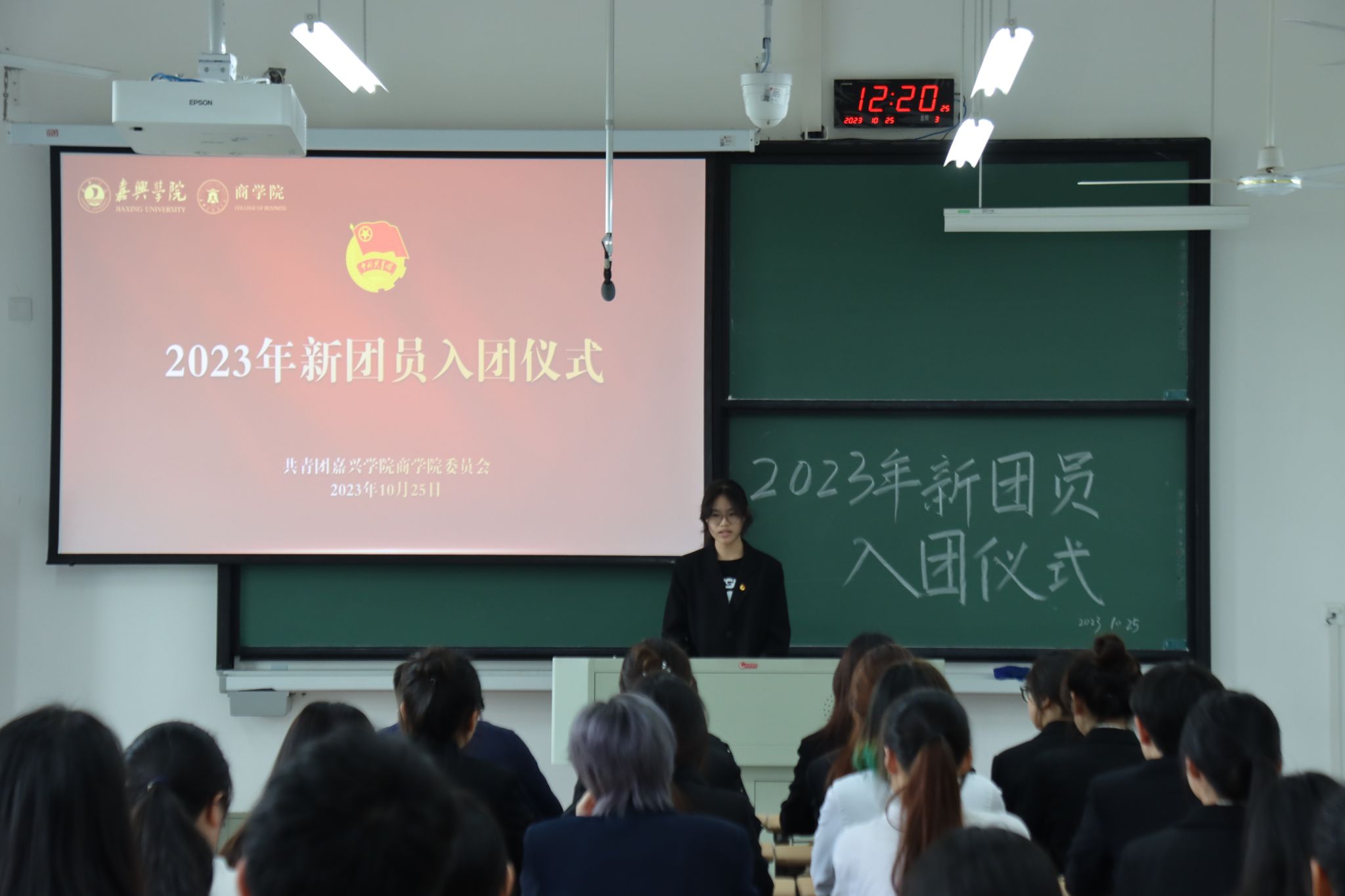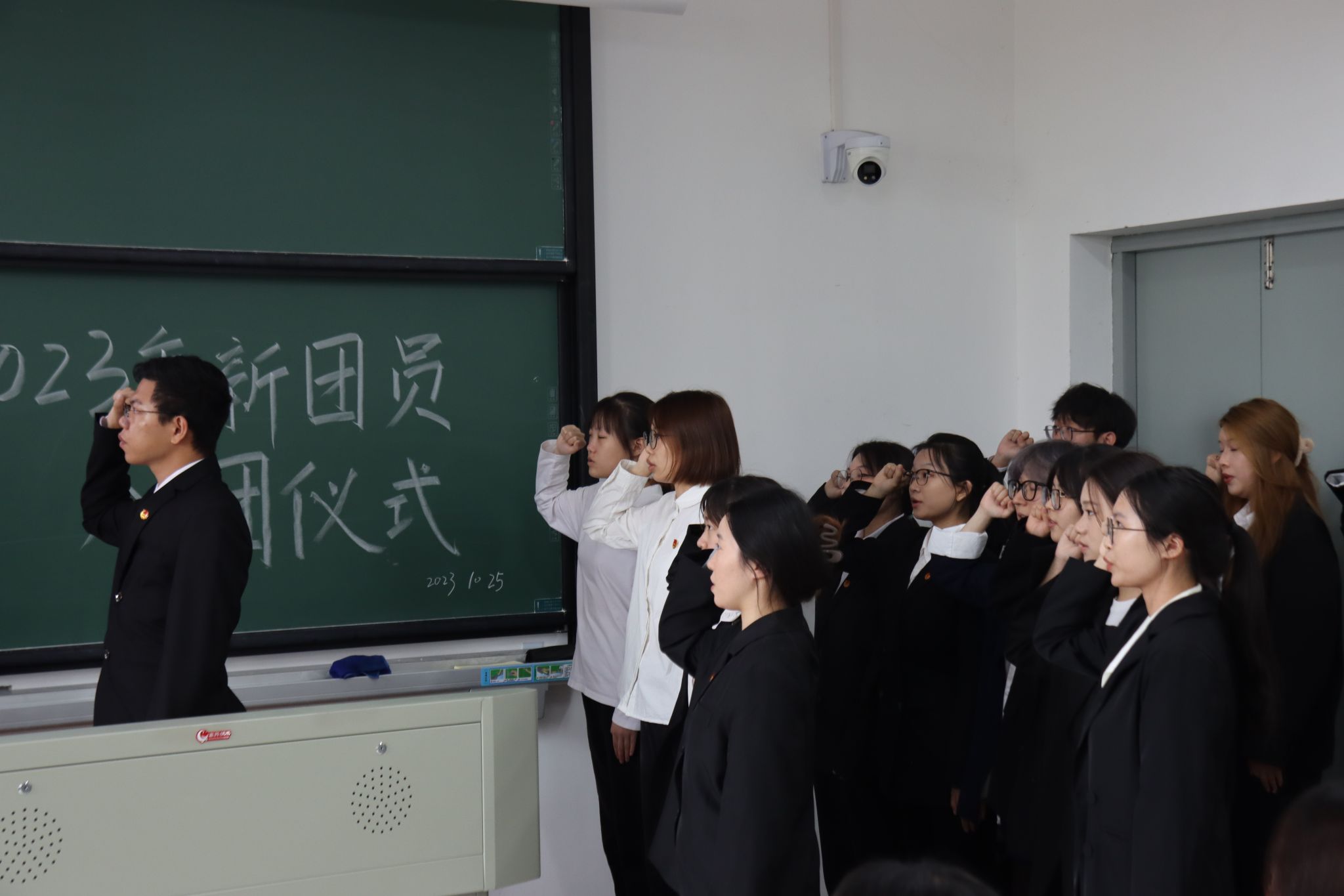 活动在庄严的国歌中拉开帷幕。主持人宣读了2023年新发展团员名单,带领各位新团员共同学习了《团章》中有关团员的义务和权利的条款。老团员为新团员佩戴上了属于自己的团徽,并带领全体新团员进行入团宣誓:“我志愿加入中国共产主义青年团,坚决拥护中国共产党的领导,遵守团的章程。执行团的决议,履行团员义务,严守团的纪律,勤奋学习,积极工作,吃苦在前,享受在后,为共产主义事业而奋斗!”新老团员一同向团组织表明自己的入团决心,向祖国发出了“请党放心,强国有我”的最强音!