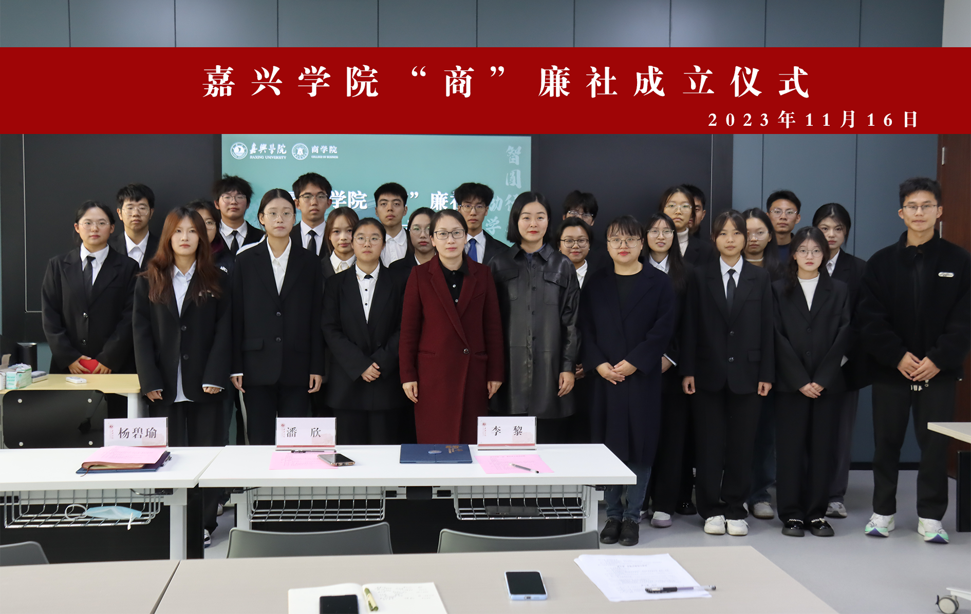在明德楼268举行“商”廉社成立仪式,社团指导老师、校纪检监察室(巡察办)副主任杨碧瑜,袋鼠影视