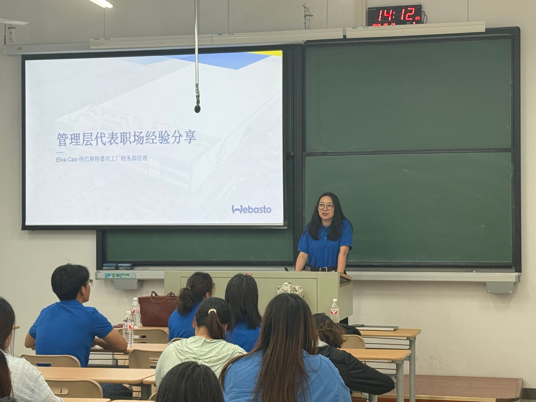 伟巴斯特(嘉兴)工厂人事部经理Vicky Yu首先介绍了公司的基本情况。财务部经理Elva Cao、质量部工程师Henry Sun作为校友代表分别分享了初入职场的感悟与经验,强调了主动学习、遵守流程和持续改进的重要性。人事部高级专员Sunny He讲解了简历制作的核心要点和面试技巧,通过案例帮助学生掌握STAR法则等实用工具,提升求职竞争力。活动现场还设置了提问环节和简历一对一诊断,学生们积极参与互动,收获颇丰。