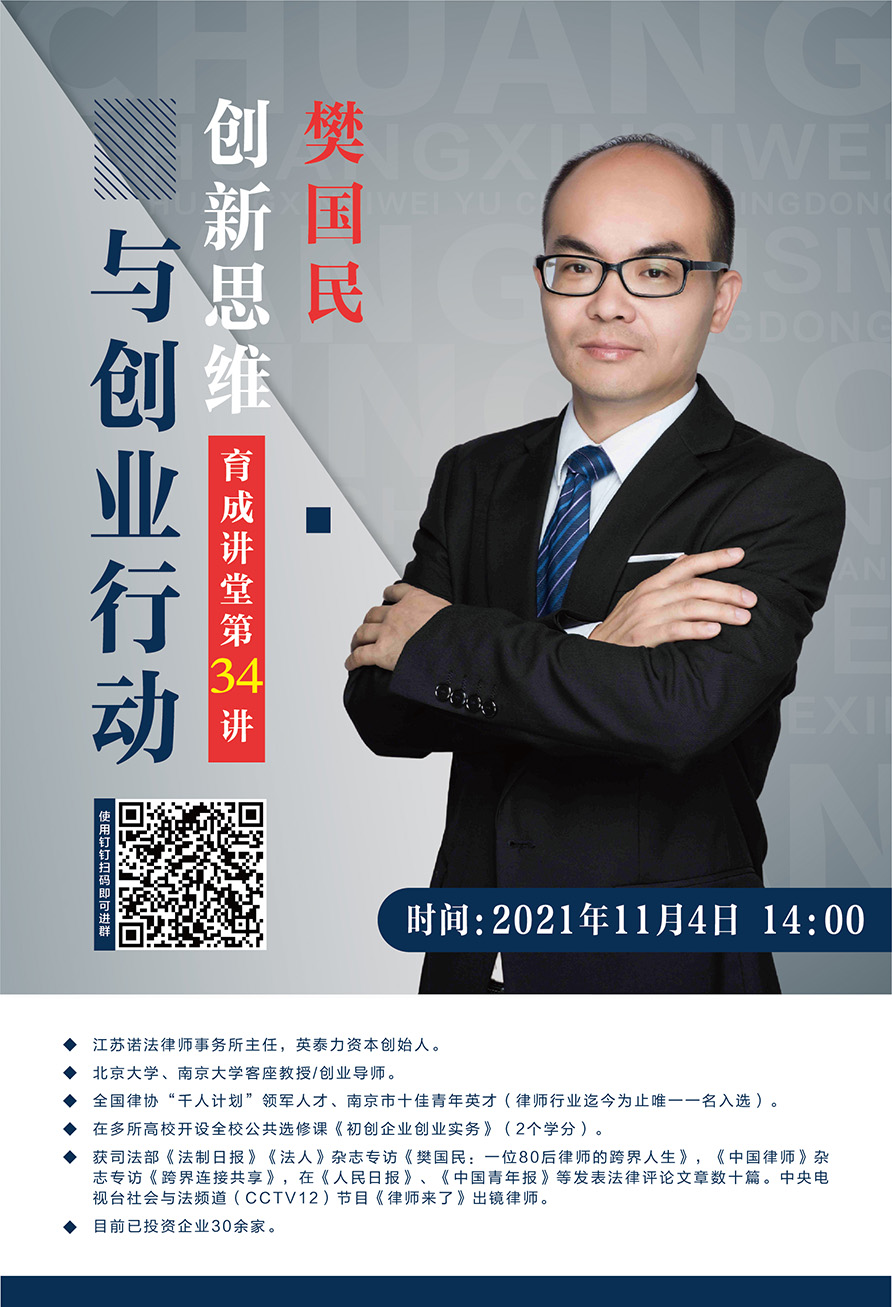 114日下午,江苏诺法律师事务所主任、英泰力资本创始人,北京大学、南京大学客座教授、创业导师樊国民应邀作客育成讲堂第34讲,为近500名师生作题为“创新思维与创业行动”的云讲座。此次云讲座由创业学院主办、袋鼠影视 承办。