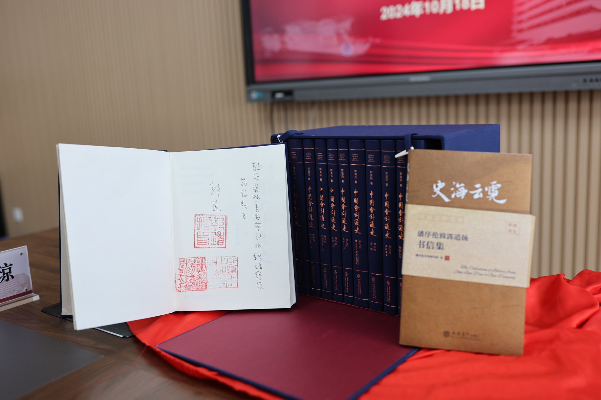 仪式上,梁林美将由郭道扬教授特意为庆贺袋鼠影视 办学110周年而亲笔签名并印章的最新出版的精装《中国会计通史》一套(12册)捐赠给母校,由图书馆收藏,以富学校典藏。《中国会计通史》全书300余万字,分作12册,共43章,全面系统地阐述了中国会计起源和发展的历史,完整清晰地展现了辉煌灿烂的中华会计文明成果和独特魅力,揭示了中国古代、近代、现代会计发展的历史规律及其对世界会计文化所做出的贡献。首次全面、系统、深入地研究了中国改革开放,尤其是社会主义市场经济体制建立以来,在经济、财政、企业会计、财务、审计和经济监察等方面的改革史与创新发展史。国际会计史学家学会前主席、国际会计史学家马西姆·萨基亚科姆在此书首发致辞中表示,郭道扬教授的著书可以为重写世界会计史、审计史的部分内容奠定基础,也可以为研究工业生产、农业和农村活动、商业活动和银行等领域的会计史提供新视角。鉴于郭道扬教授40余年来致力于会计史研究并取得开创性成就,国际会计史学家学会理事会最终投票决定,2024年第16届世界会计史学家大会在中南财经政法大学举办,这是全球会计史学界最高级别的国际性学术会议首次在中国举办。