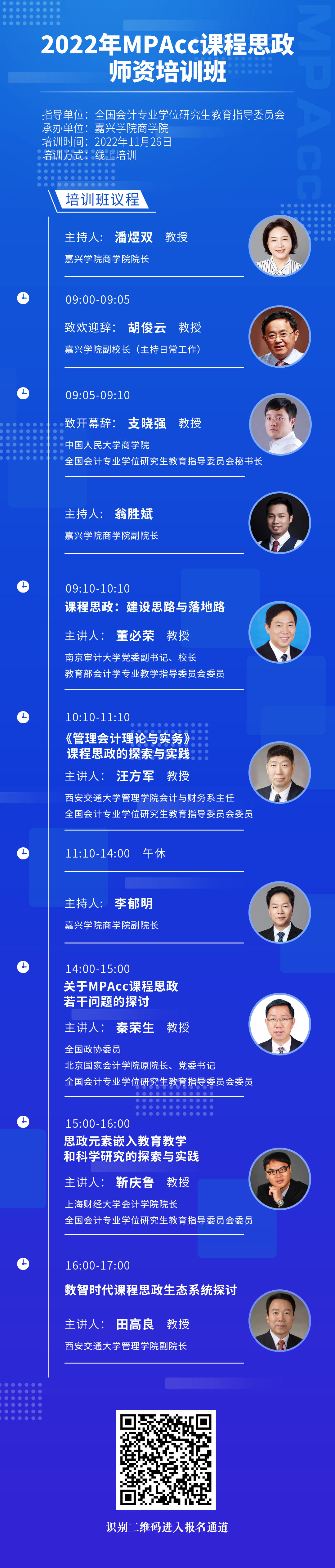 为全面落实立德树人根本任务,着力提升MPAcc教师课程思政教学能力,由全国会计专业学位研究生教育指导委员会指导,嘉兴学院承办的2022年MPAcc课程思政培训班定于2022年11月26日举办。现将有关事项通知如下: