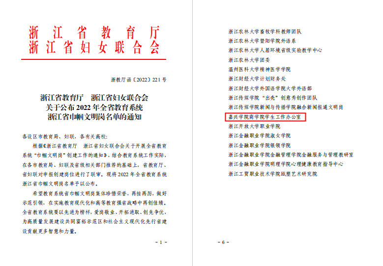 近日,浙江省教育厅、浙江省妇女联合会联合发文公布2022年全省教育系统浙江省巾帼文明岗授予名单,全省教育系统仅65个单位(团体)获此殊荣,袋鼠影视 学生工作办公室位列其中。
