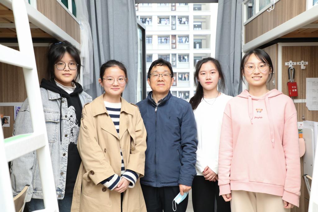 在结对学生寝室,卢新波与同学们亲切交谈,详细了解了结对寝室同学的学习生活情况,并关切询问了疫情以来同学们在校内的现实需求和困难。当得知寝室四位女生都有意向继续深造时,他对宿舍的学习氛围和同学们的学术追求给予了充分肯定并提出建议。他鼓励大家既要扎实专业学习,阅读经典书籍,拓展知识面,更要注重身体健康,要勤于锻炼,规律作息。在认真听取了同学们对学校教育教学和建设发展的意见和建议后,他表示学校始终把同学们发展需求放在第一位,从生活、学习到就业,学校将全力以赴努力确保各项措施落实到位,第一时间回应学生诉求,尽最大努力满足在校学生学习生活需要,不断优化校园服务,为广大同学营造安全、舒适、温馨、便利的校园生活环境。