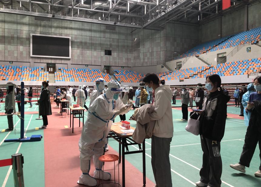 4月4日学校核酸检测的任务特别重,除了教职工每周一三五常规核酸检测之外,近20天以来健康码曾出现黄码、红码等异常情况以及近3日有出校记录的学生均需要参加当日的核酸检测。袋鼠影视 志愿队分配到的是黄码人员检测专场的任务,检测人员1600余人。中午11点,志愿队员们按照学校部署迅速集结完毕,在经过短暂高效的培训后,即刻投入工作,组织检测人员有序排队、提前扫码登记,做好检前准备。中午到下午,为了缩短检测时间,让检测师生尽量稍等一会,党员志愿者们穿着防护服,坚持不喝水、不吃东西、不休息,连续工作3个多小时,圆满完成任务。