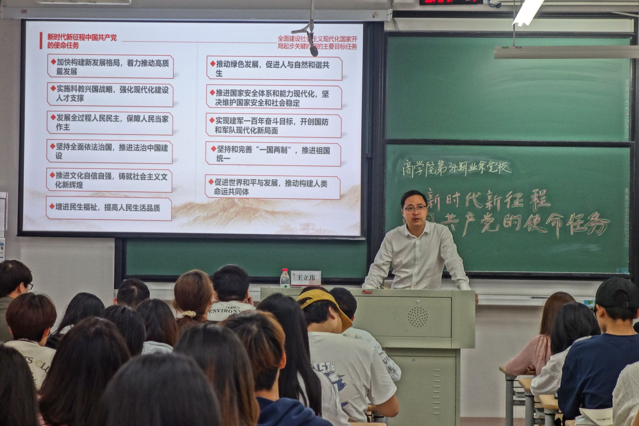 王立玮以新时代新征程中国共产党的使命任务为主题,从党的初心与使命、中国式现代化的中国特色和本质要求、全面建成社会主义现代化强国“两步走”总的战略安排和全面建设社会主义现代化国家开局起步关键时期的主要目标任务四个方面讲授党课。王立玮指出,中国共产党的初心和使命,就是为中国人民谋幸福、为中华民族谋复兴,中国共产党的领导是实现中国式现代化的根本保证。他鼓励学员们,新时代是奋斗者的时代,也是青年人的时代。要牢记党的初心和使命,坚定理想信念,在中国式现代化新征程上肩负起中国青年的使命与担当。