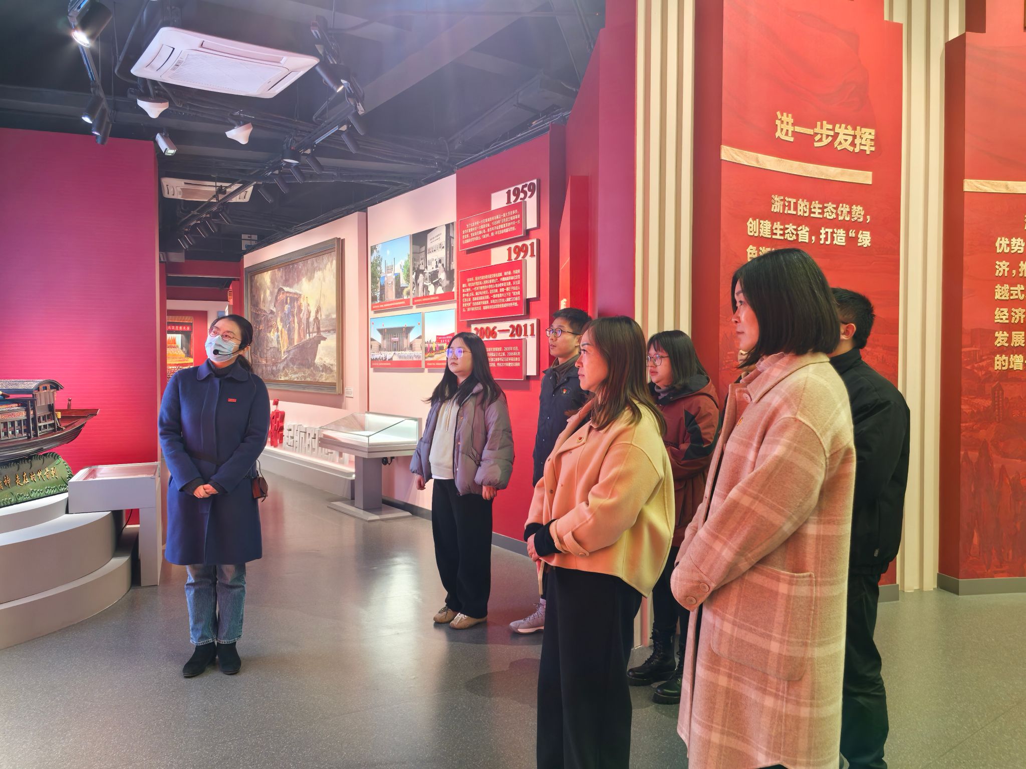 主题展共分为弘扬践行红船精神、坚持以改革创新推动高质量发展、全面融入长三角一体化发展、城乡融合看嘉兴等四大板块。展览通过丰富的图文资料、详实的历史记录和生动的多媒体展示,全景式呈现了“八八战略”在嘉兴的生动实践。参观过程中,全体人员认真聆听讲解,不时驻足观看,交流讨论,沉浸式感受“八八战略”指引下,20年来嘉禾大地的精彩蝶变。